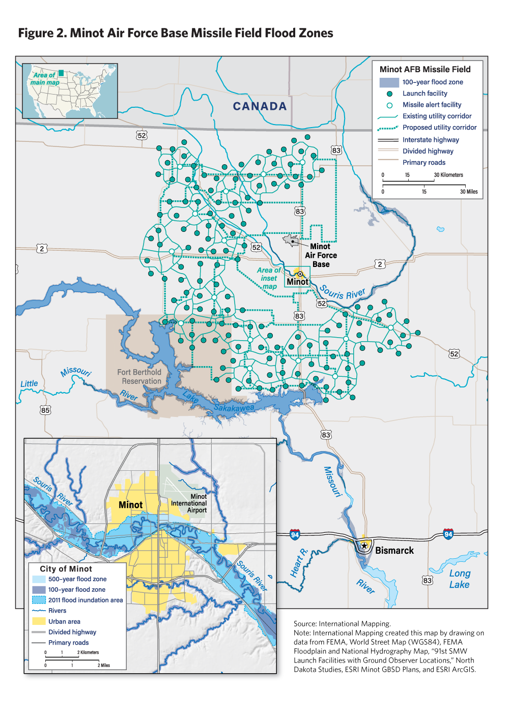 Setting aside these limitations, figure 2 draws on FEMA data given the NFHL’s wide recognition as an authoritative source and the air force’s reliance on the data in the Sentinel EIS.73 The map presents as much FEMA data as are publicly available, including data from a dedicated assessment of the city of Minot conducted after the 2011 flood.74 As illustrated, the base and many of the LFs and MAFs do not sit in flood zones, at least as currently mapped by FEMA. Some utility corridors do, however, especially near Lake Sakakawea, where some LFs also come quite close to the 100-year flood zone. Additionally, the map indicates that some key highways and primary roads intersect with 100-year flood zones. Given its scale, the map does not indicate whether access roads, including unpaved roads that provide access to isolated LFs and MAFs, are in flood zones.