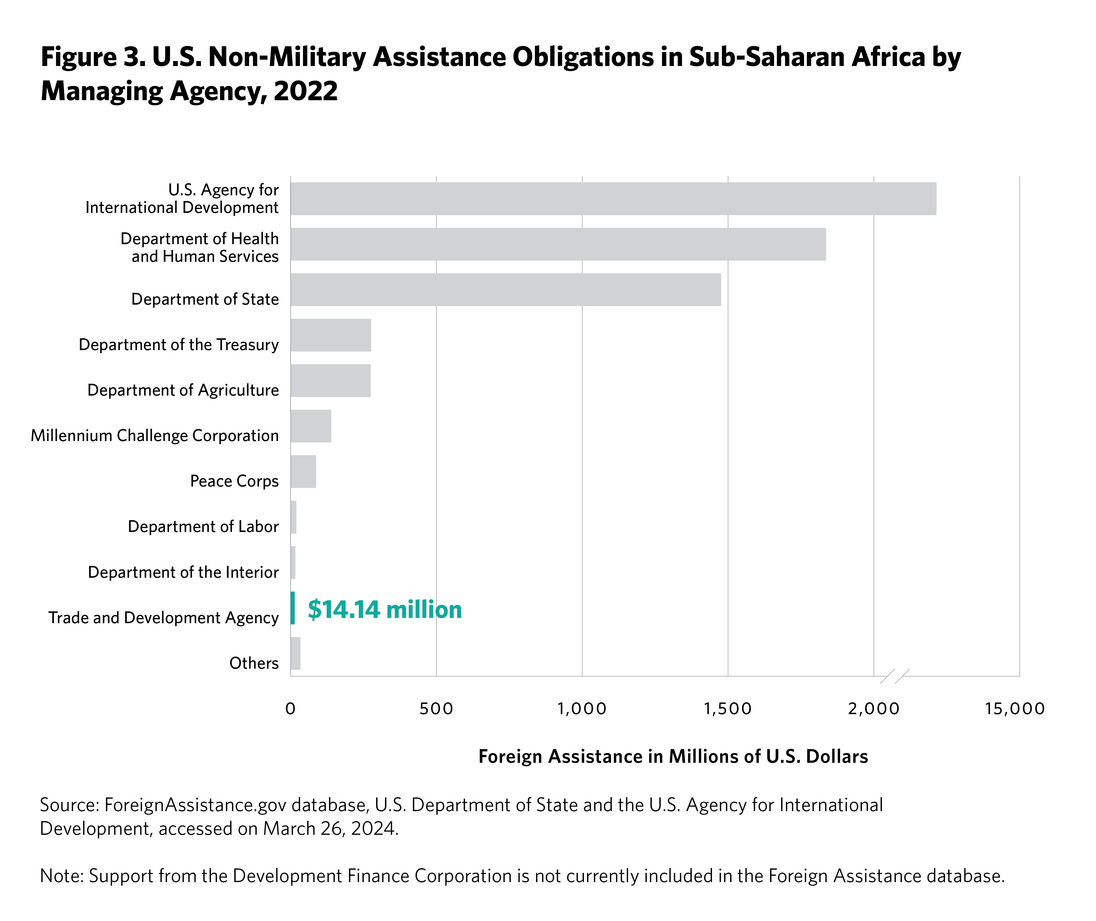 There are several caveats to keep in mind when looking at this data. First, funding for economic development is not a perfect proxy for the level of infrastructure support (health infrastructure, for example, can be captured under the health portfolio). Second, the types of expenditure in these various categories are not directly comparable: to some extent, these funding levels reflect the types of assistance being provided. U.S. health and humanitarian assistance programs typically include direct procurement of medicine, emergency supplies, and vaccines—and therefore require large U.S. expenditures. By contrast, U.S. economic development programs often rely heavily on technical assistance designed to leverage much greater amounts of private investment. Third, the Foreign Assistance database does not currently include DFC financing, which directly supports infrastructure via loans, guarantees, equity stakes, and insurance. Nevertheless, to someone looking at this data on its face, the overall disparity in funding levels might suggest that U.S. foreign policy, despite its rhetoric on infrastructure, continues to prioritize the health and humanitarian aid sectors in Africa over economic development.